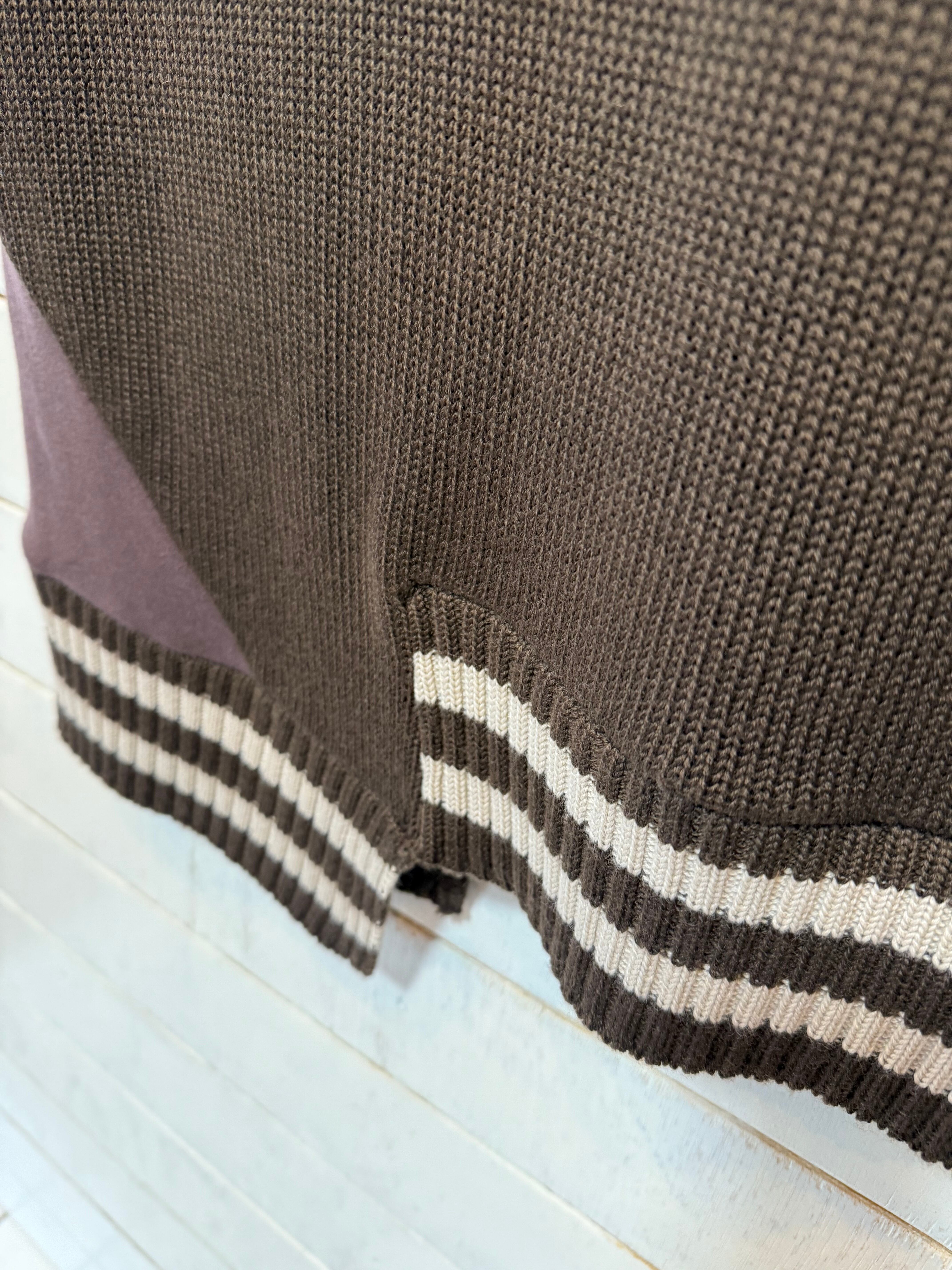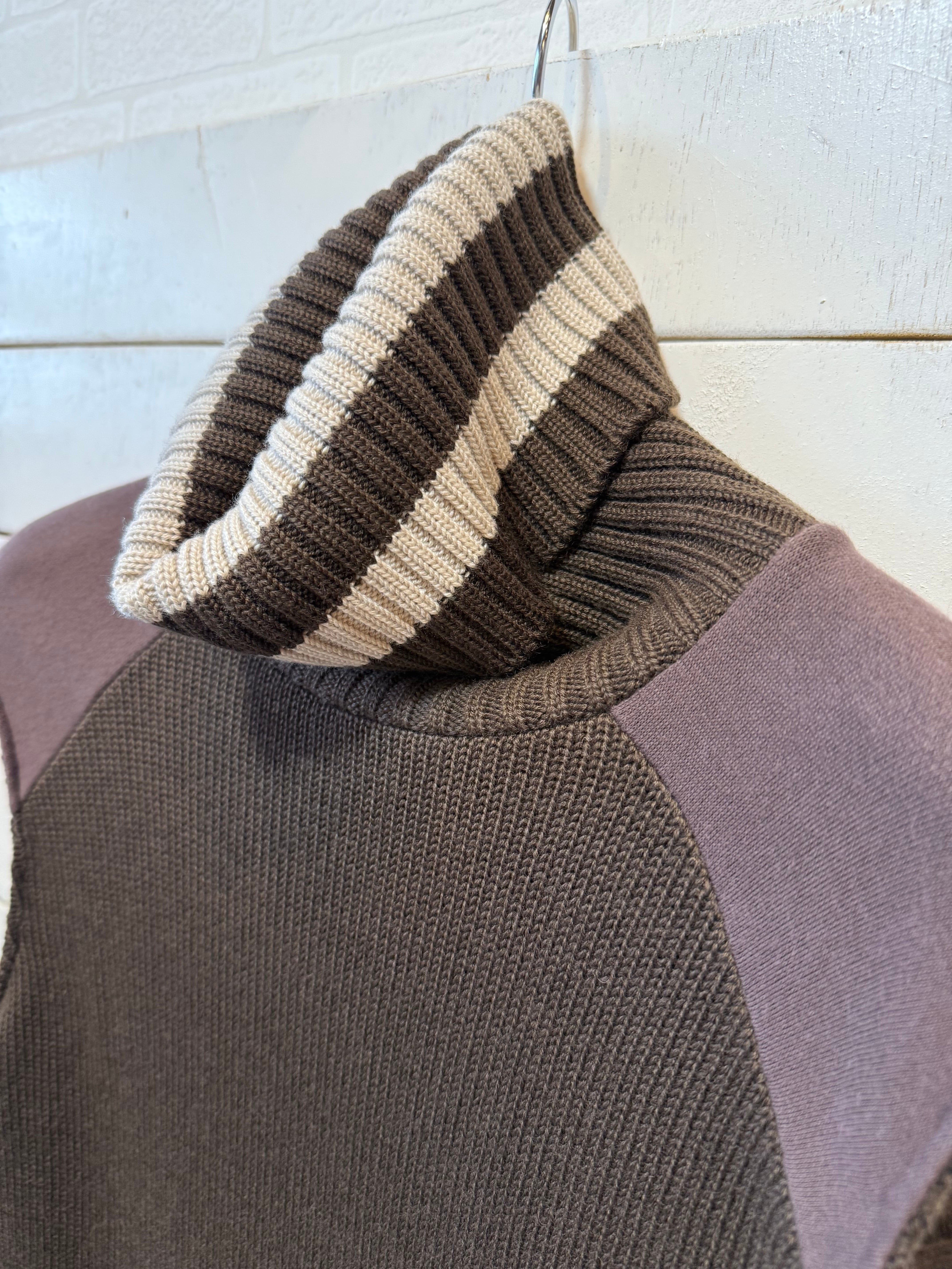 モチモチ感のあるコットン100%ベア裏起毛とニット工場で編み込んだウール混ニットでドッキング 太いボーダーでのリブ編みしたベストは暖かさとおしゃれ感を同時にオン