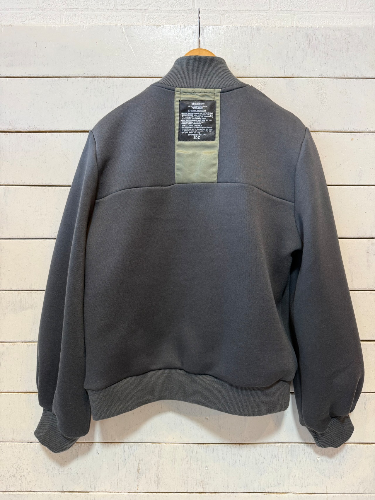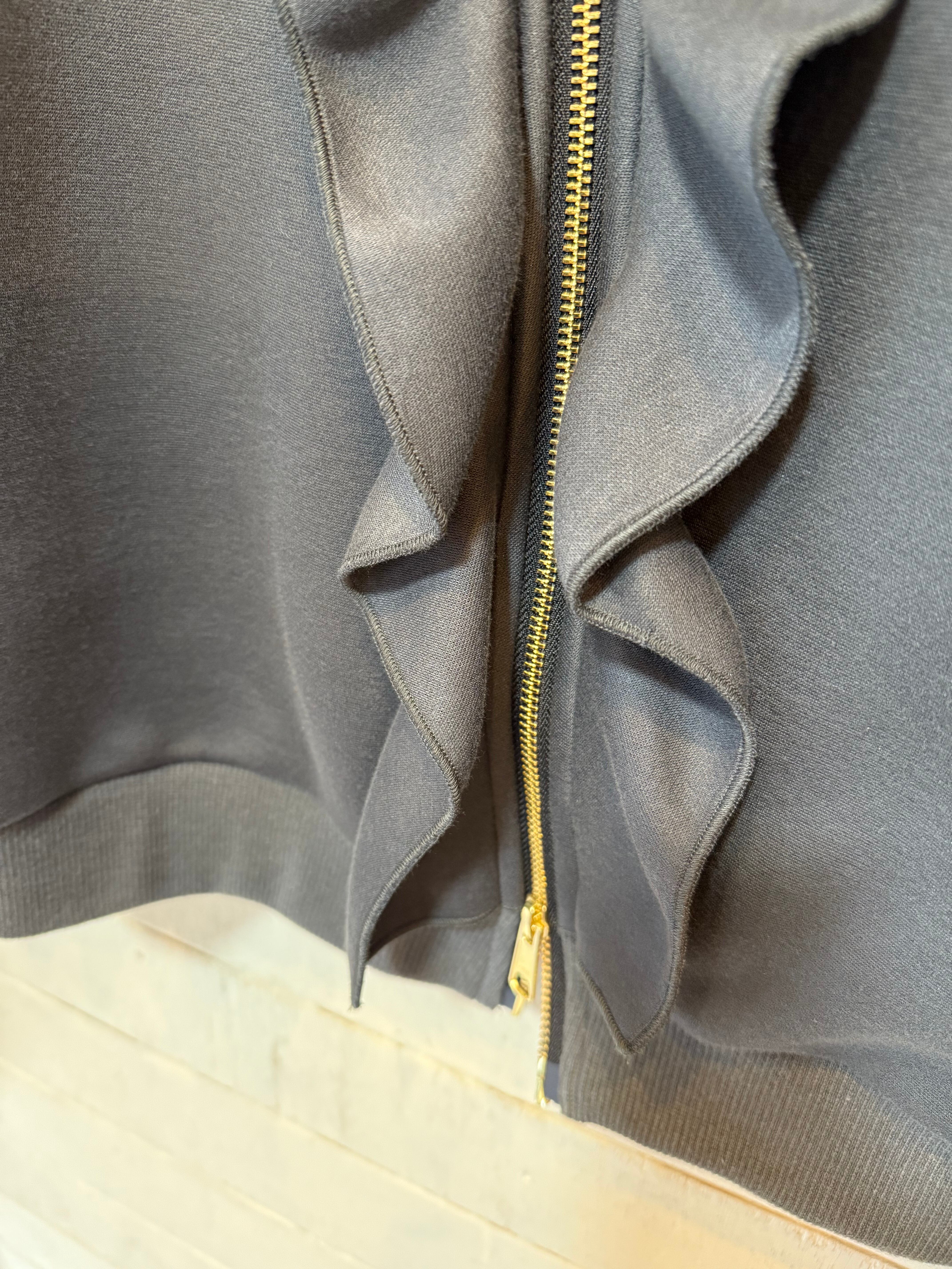 キレイめの表面感とハリコシのあるハイゲージプレシャスダンボールニットを使用したライダースライクなフリルジャケット